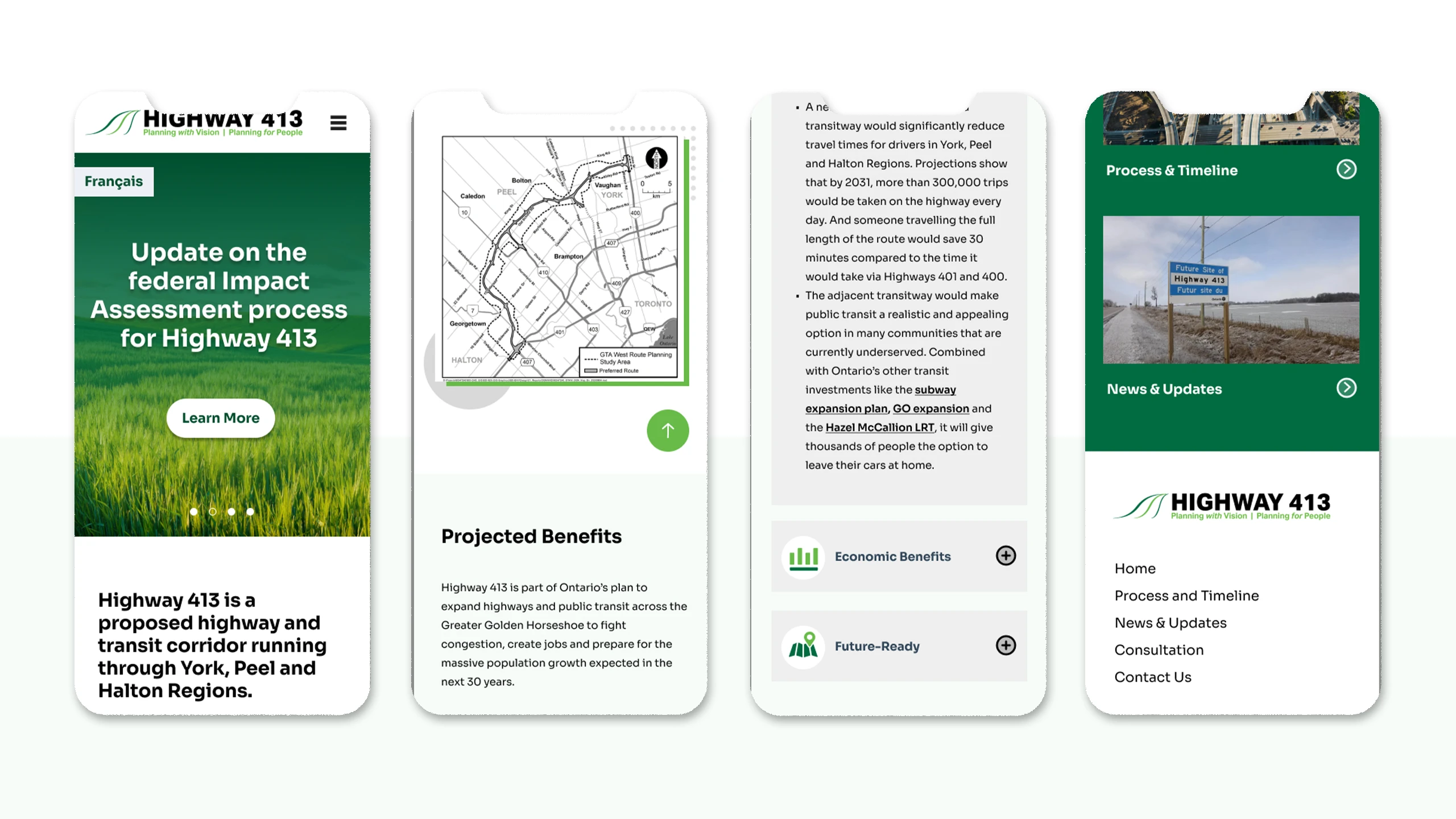 Designed the Highway 413 website in Figma and built it using WordPress, following the Ministry of Transportation’s branding and accessibility standards. The site presented a large volume of studies, reports, and project timelines, requiring a clear content hierarchy and intuitive navigation.