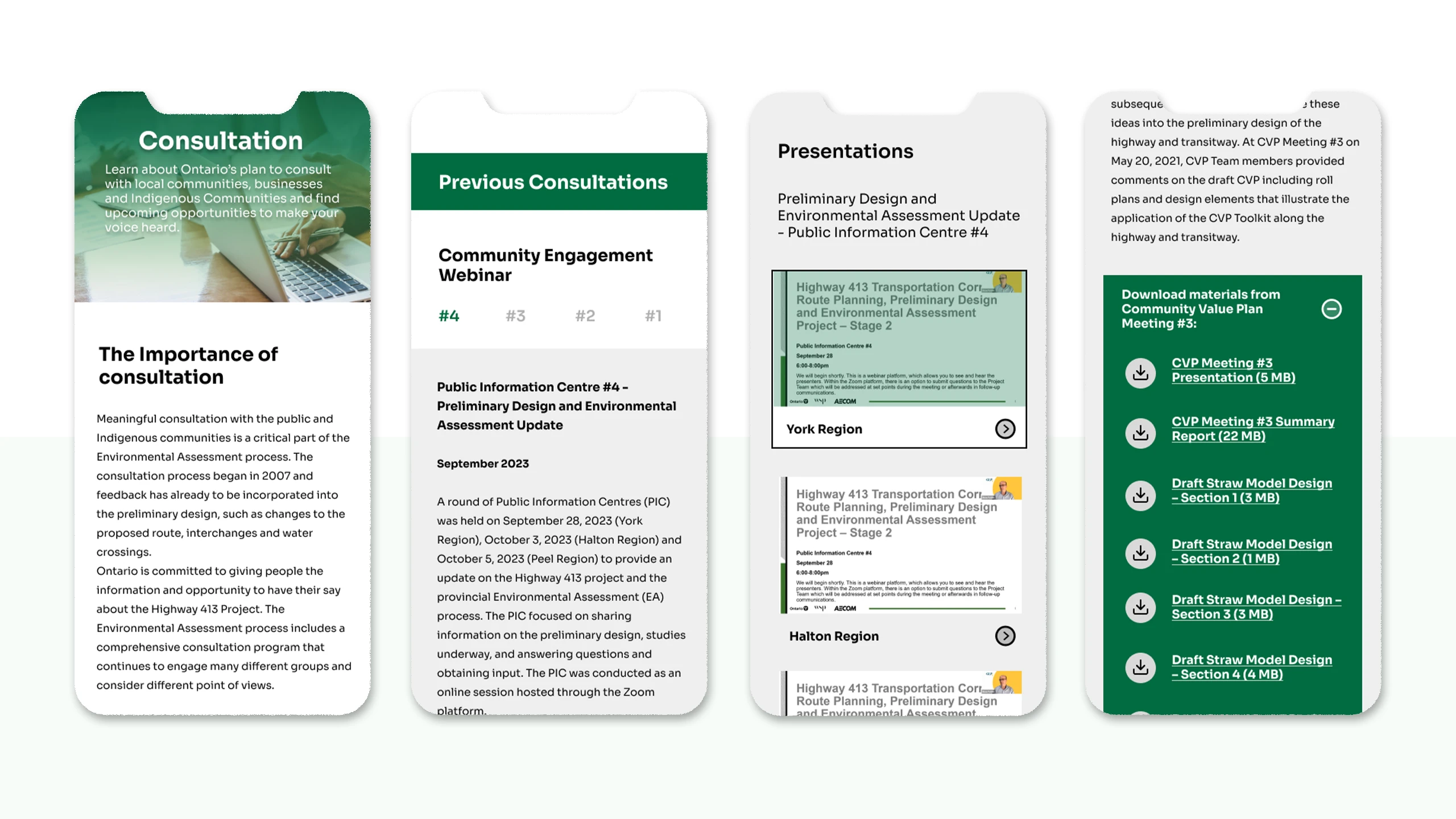 Once the design direction was approved, I started designing the Highway 413 website in Figma and developed it using WordPress, ensuring alignment with MTO’s branding and accessibility standards. The site contained a large volume of studies, reports, and project timelines, so I implemented clear sections, categorized tabs and a dedicated downloads page to help users quickly locate relevant documents.